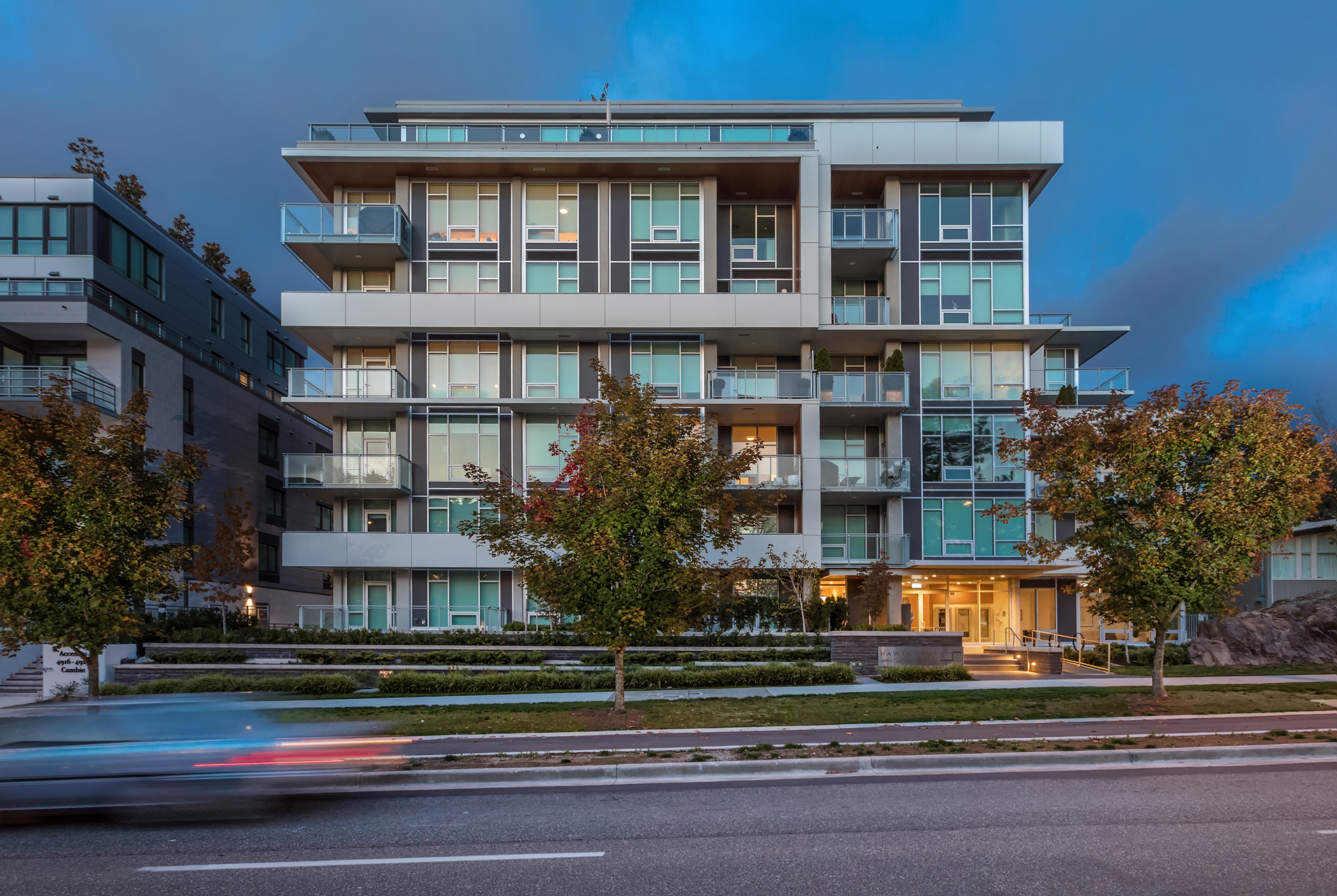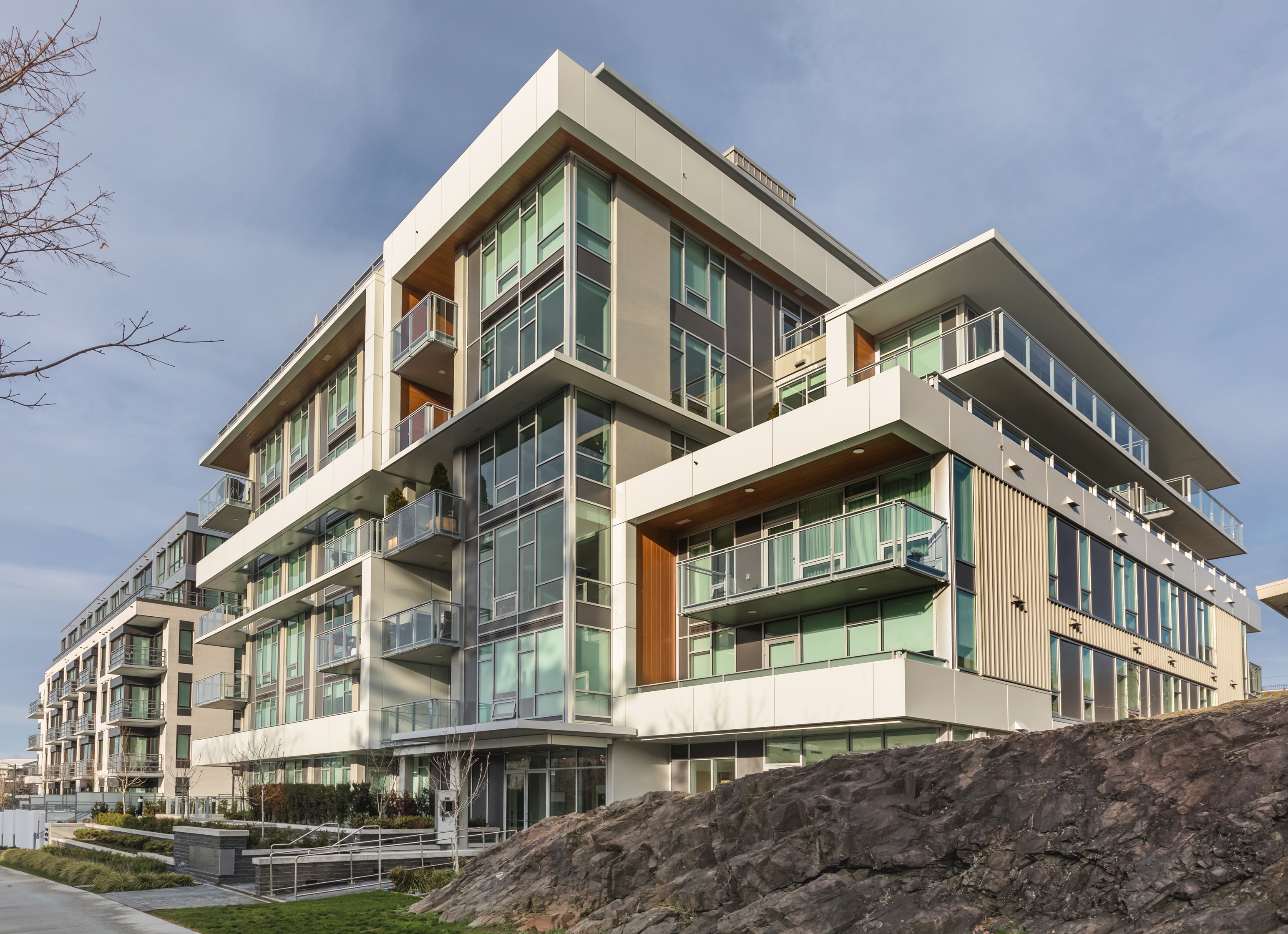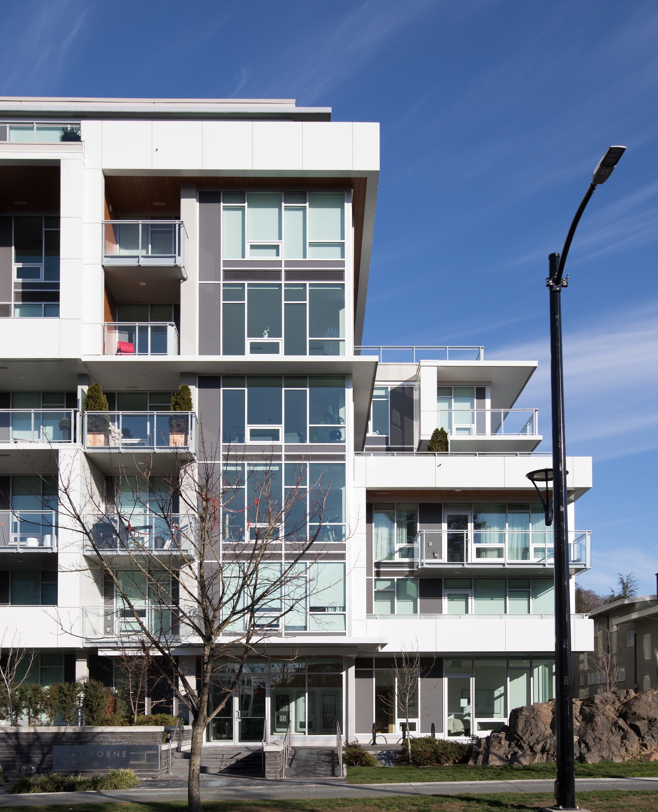 Hawthorne is a seven-storey development that preserves the mid-century Wong residence and volcanic rock feature on Cambie Street, integrating them into its landscape design. Sculpted massing and earthy materials echo Cornelia Hahn Oberlander’s original garden vision, creating a striking dialogue between heritage and modernity. With sweeping views of Queen Elizabeth Park, the building’s bold façade and generous setbacks set a new benchmark for contextual urban design.